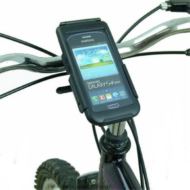 Mobiltelefon tartó Samsung Galaxy S4 mini kerékpárra vagy motorkerékpárra. A tartó rögzítése a kormányra.