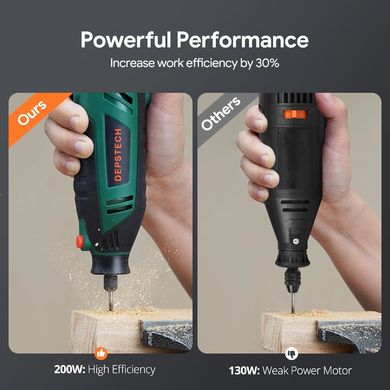 A Depstech forgószerszámkészlet nagy teljesítményű 200 W-os tiszta réz motorral, 6 változó fordulatszámmal rendelkezik 10 000 és 40 000 fordulat/perc között, hogy simábbá tegye a munkát, és akár 30%-kal növelje a munka hatékonyságát. Könnyedén szabályozhatja a forgószerszám sebességét a finom gravírozáshoz fában, üvegben, fémben és más anyagokban. A rugalmas tengely javítja a termék rugalmasságát, alkalmas finom polírozásra, gravírozásra vagy csiszolásra, és könnyen kezelhető a nehezen hozzáférhető csöveken, kapcsolódási pontokon és sarkokon. Szabadítsa meg kezét a stressztől, és fedezze fel, hogy mit jelent a könnyű barkácsolás.