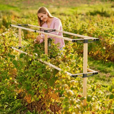 A BERRY BUDDY egy stabil tartószerkezet mindenféle bogyósgyümölcs, például málna, szeder, egres és ribizli számára. Kiváló minőségű, EU-FSC tanúsítvánnyal rendelkező fából készült, masszív szerkezetből, 2 állítható magasságú, szövettel ellátott rácsból és a könnyű rögzítést biztosító fémhegyekből áll. A tartó úgy lett kialakítva, hogy ellenálljon a kültéri körülményeknek, és optimális támaszt nyújtson a gyümölcsöknek. A BERRY BUDDY együtt növekszik a bogyós gyümölcsökkel. A magasságban állítható keretek könnyen alkalmazkodnak növényei növekedéséhez, és rugalmas támasztást biztosítanak a növekedés minden szakaszában.