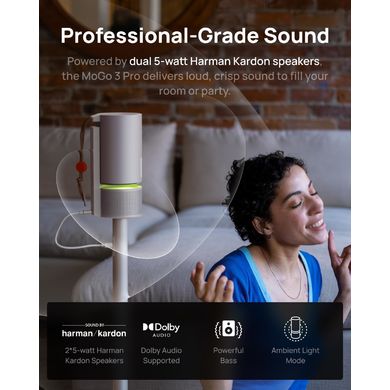 Természetesen a hang is fontos tulajdonsága egy projektornak. A MoGo 3 Pro két 5 wattos Harman Kardon hangszóróval van felszerelve, amelyek hangos és tiszta hangzást produkálnak, így könnyen megteremtheti a megfelelő hangulatot az otthoni vetítéshez vagy partihoz. Ha Bluetooth-on keresztül mobiltelefonnal párosítjuk, a kivetítő önálló hangszóróként is használható, vagy aktiválhatjuk a környezeti fény módot, hogy bármilyen környezet szórakoztató, fénypezsdítő kiegészítője legyen. Ezzel a projektorral akár a szabadban is élvezheti a kalandokat. Egyszerűen csatlakoztassa a MoGo 3 Pro-t egy 65 W-os powerbankhoz az USB Type-C csatlakozón keresztül, és élvezze a végtelen szórakozást a csillagok alatt. A MoGo 3 Pro több bemeneti porttal is rendelkezik a zökkenőmentes csatlakoztathatóság érdekében.
