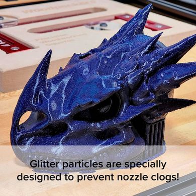 PLA szál sötét színekkel és ezüst alumínium részecskékkel a galaktikus hatás érdekében. Ajánlott fúvóka 0,6 mm. 1,75 mm, 1 kg-os, környezetbarát orsó.