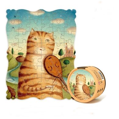Finoman illusztrált, hegedülő macska motívummal ellátott puzzle, amely az egyes darabok mérete és minősége miatt ideális a kis építők számára.