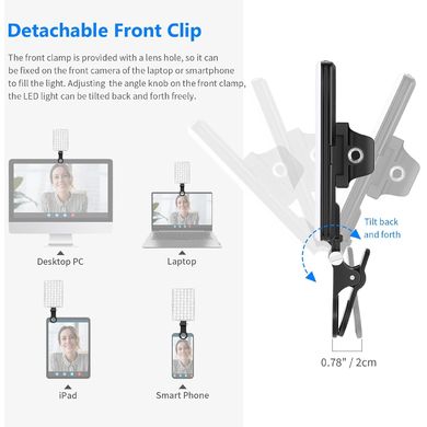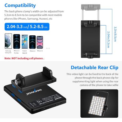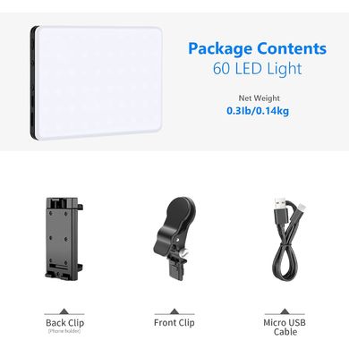 Újratöltése hálózati töltőről, power bankról vagy számítógépről 5V/1A áramforrással történikUSB Type-C és micro USB töltőportokon keresztül. Kétféle rögzítési mód áll rendelkezésre. A kör alakú klipsz az okostelefonra, táblagépre vagy legfeljebb 0,78"/20 mm vastagságú laptopra rögzíti a lámpát, és nem akadályozza az elülső kamera működését. A telefontartó rögzítés 2–3,3" (52–85 mm) széles okostelefonokhozilleszkedik, és a lámpát a telefon hátuljára szereli, hogy kiegészítő lámpaként használhassa. A két 1/4"-os csavarfurat lehetővé teszi, hogy a lámpát közvetlenül bármilyen fényállványra lehessen szerelni.