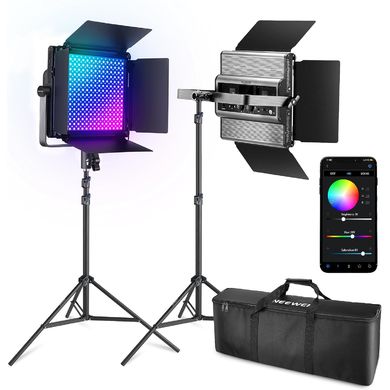 2db nagy teljesítményű Bi-Color és RGB fotólámpa készlet, 480× RGB LED, 60W, 7300 Lux/1m, fényhőmérséklet állítható 2500K és 8500K között.