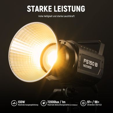 A NEEWER FS150B állandó stúdiófényszóró kiváló minőségű és hatékony COB LED-eket használ a kivételes fényerő, 130 W villódzásmentes teljesítmény és 1 méteres távolságban 72 000 lux maximális fényerősség érdekében. A hordozható reflektor 1,7 kg súlyú és 200×130×120 mm méretű, 180°-os dönthető állványadapterrel rendelkezik a szabadszögű konfigurációhoz. Ezek a jellemzők ideálisak portréfotózáshoz, interjúkhoz, YouTube/TikTok videófelvételekhez, filmezéshez, élő közvetítésekhez és stúdióprodukciókhoz. A PWM dimmelési technológiával a fényerősség 0 és 100% között 1%-os lépésekben állítható.