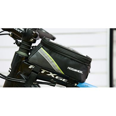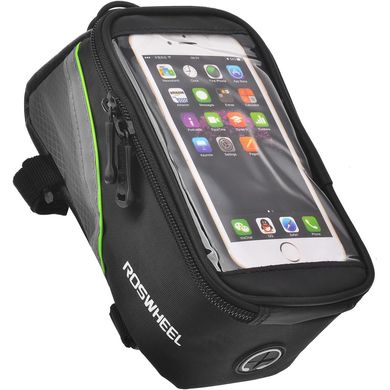 Vízálló könnyű táska fényvisszaverő zöld csíkkal a telefonkerék felső keretcsövén, cipzáras zsebbel dokumentumok és apró tárgyak tárolására vagy power bank,