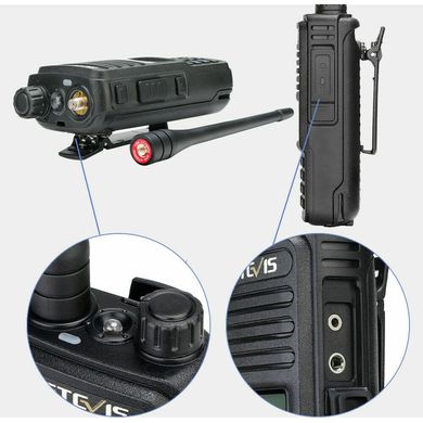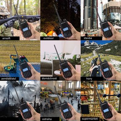Kézi kétsávos rádió, miniatűr méret, 5W teljesítmény, UHF/VHF sáv, hatótávolság 3 km-ig, 200 csatorna, FM rádió, VOX, „Kenwood“ csatlakozó.
