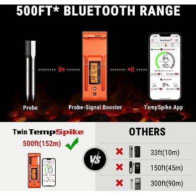 A ThermoPro TempSpike TP-962 vezeték nélküli 2 szondás konyhai hőmérője a legmodernebb Bluetooth 5.2 átviteli technológiát használja, hogy vezeték nélkül készíthesse el az ételeket az Ön igényei szerint. Ez a készülékelegáns kialakítással büszkélkedhet, mivel az összes fejlett technológia a szondába van integrálva, így nincs szükség kábelekre. A megbízható vezeték nélküli kapcsolatnak köszönhetően amellékelt mobilalkalmazással kényelmesen nyomon követheti a hőmérséklet-méréseket akár 150 méter távolságból is. A hőmérőhöz egy pár vezeték nélküli hússzonda tartozik, amelyek mindegyike külön érzékelőkkel van felszerelve, amelyek lehetővé teszik az élelmiszer hőmérsékletének (a belsejében és a felszínen) és a környezetnek a mélyreható elemzését.
