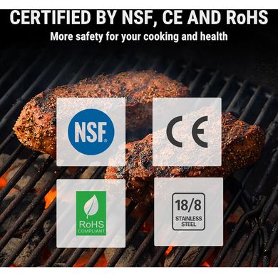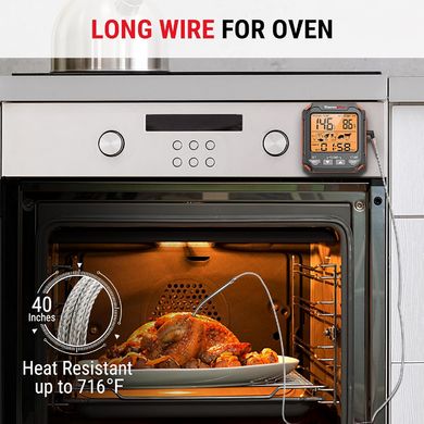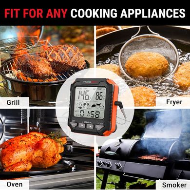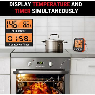 Grillező- és konyhai hőmérő, amely alkalmas minden ételhez és folyadékhoz, amelyet sütőben, grillen, BBQ-n vagy füstölőben készítenek. A hőmérő programozható riasztással rendelkezik az adott ételekhez előre beállított hőmérsékletekre, vagy saját preferenciái szerint állíthat be egyedi hőmérsékleteket. 16 cm-es sütő szondával, ±1°C mérési pontossággal és széles, 0°C és 300°C közötti hőmérséklet-tartománnyal rendelkezik, ami gyors és pontos eredményeket biztosít a tökéletes főzéshez. Ez a digitális ételhőmérő egyszerre képes kijelezni a hőmérsékletet és az időzítőt, stopper és visszaszámláló funkciót is kínál, amely akár 99 óra 59 percre is beállítható.