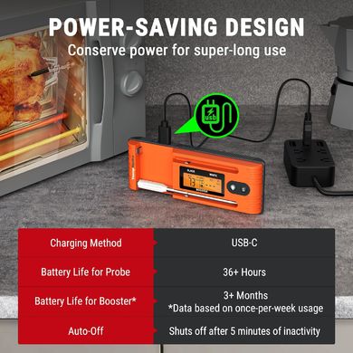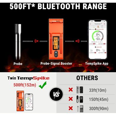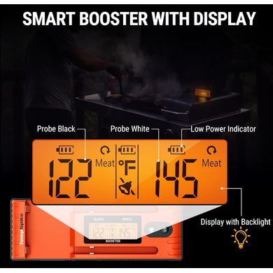 A ThermoPro TP-973 TempSpike Plus vezeték nélküli húshőmérőminden grillmester profi segítője. A TempSpike sorozat a legmodernebb Bluetooth 5.2 kommunikációs technológiával rendelkezik, és a piacon az egyetlen olyan vezeték nélküli hőmérőt kínálja, amely akár 150 méteres távolság ból (akadályok nélkül) is képes nyomon követni az ételek hőmérsékletét, dinamikus főzési környezetet biztosítva. A Booster kijelzőjén intelligens mobilalkalmazás nélkül isellenőrizheti a hús és a környezet hőmérsékletét.