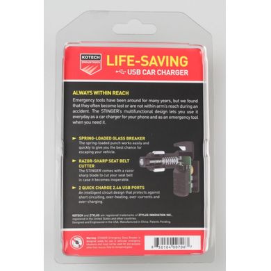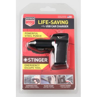 A Ztylus Stinger egy USB-töltő 2×2,4A kimenettel és biztonsági funkciókkal, hogy baleset esetén kimenekülhessen az autóból – egy tüske az ablak betöréséhez és egy penge az öv elvágásához.
