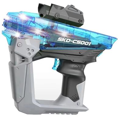 Gél vízilabdapisztoly, űrdizájn, alkalmas szabadtéri tevékenységekhez, 12 éves kortól, hatótávolság kb. 30 méter, újratölthető akkumulátor, kék színű.