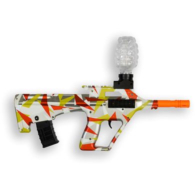 Gél vízipisztoly, alkalmas szabadtéri tevékenységekhez, 14 éves kortól, hatótávolság kb. 15 méter, újratölthető akkumulátor, lövésszám 7–8 lövés/másodperc, összecsukható szárral.