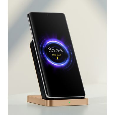 A Xiaomi Mi Wireless Charging Stand 50W teljesítményű, ergonomikus formájú és 50W teljesítményű vezeték nélküli asztali töltő.
