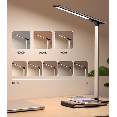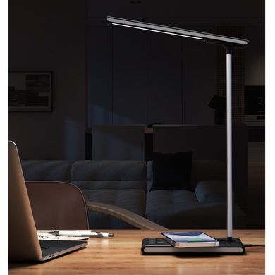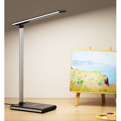 LED asztali lámpa, 3 fényhőmérséklet. 5 fényintenzitás, 10 W-os vezeték nélküli töltő, USB töltőkimenet, óra, ébresztőóra, naptár, hőmérő.