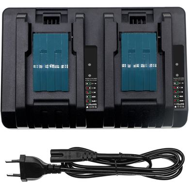 Akkumulátor töltő Makita elektromos szerszámokhoz, 220V-os tápegység, 12–18V-os kimenet, 2 akkumulátorhely, akkumulátor állapotjelzés, gyártó Cameron Sino Technology
