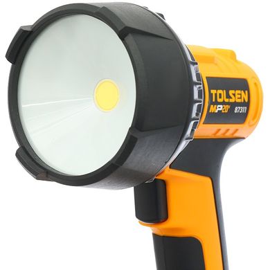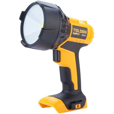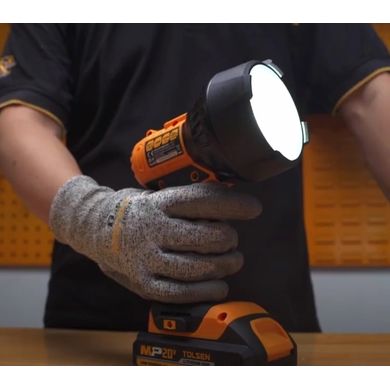 A lámpa 20V-os programakkumulátorral működik 20V LITIUM-ION PLATFORM (TOLSEN MP20V), de ez nem tartozék, ahogy a töltő sem. Ez lehetőséget ad a felhasználónak, hogy saját kompatibilis akkumulátorait használja. A nagy teljesítményű 10W-os LED hosszú élettartamot és alacsony energiafogyasztást biztosít.