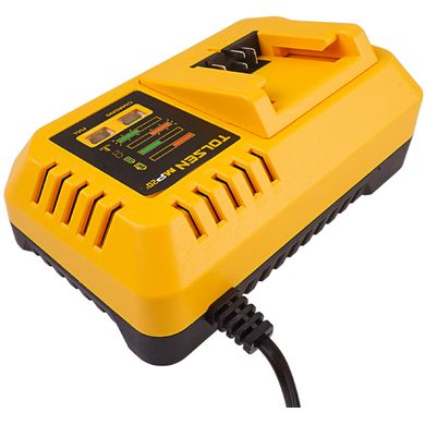 Akkumulátor töltő AKU szerszámokhoz TOLSEN 20V LITIUM-ION PLATFORM, 240 V-os tápegység, 20 V / 4 A kimenet, akkumulátor töltési állapotának kijelzése