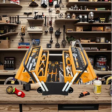 A készlet mindent tartalmaz, amire szüksége van – fogók (kombinált, önzáró, keskeny, hasító), különböző méretű csavarhúzók (lapos és Phillips), racsni a tartozékokkal, dugókulcsok és dugókulcsok, gyertyakulcsok, golyóscsapágyas kefék és egyéb tartozékok, beleértve a hosszabbító és csuklós tartozékokat. Minden rendezetten, egyedi rekeszekben tárolva.
