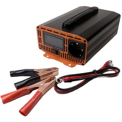 Inverter 12V-ról 230V-ra, kimenet 1× aljzat 230V, tápellátás autó akkumulátorról, teljesítmény 800W, rövidtávú 1600W-ig, 2× ventilátor, tiszta szinusz hullám, LCD kijelző.