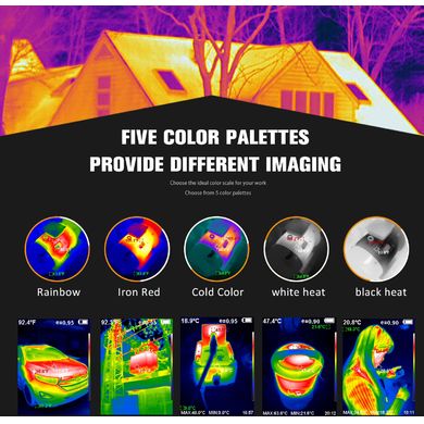 - Színpaletták: szivárvány, vas, hideg, fehér forró, fekete forró