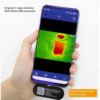 Kompakt mobiltelefonos hőkamera 32×32 px felbontással, Android operációs rendszerrel kompatibilis, USB-C csatlakozóval, PNG és MP4 tárolóval.