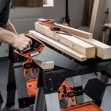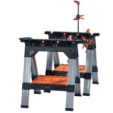 A Pony Jorgensen összecsukható építési kecske nélkülözhetetlen partner a műhelyben, a kertben és az építkezésen. Tartós műanyagból, alumíniumból és acélból készült robusztus szerkezeténekköszönhetően kecskénként akár 545 kg-ot is elbír. Ha pedig a kettőt kombinálja, egy stabil munkapadot hoz létre, amelynek teljes teherbírása akár 272 kg is lehet. Helyezzen rá OSB-, MDF- vagy más lapot, és máris egy teljes értékű munkaállomást kap.