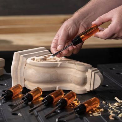 A fogantyúk tartós műgyantából készültek, amely szilárd és kényelmes fogást biztosít. A markolatok rövidebb hossza precízebbé és könnyebben kezelhetővé teszi a vésőket, még a finom véséseknél is. Az eredmény stabil vezetés és biztos vágáskompromisszumok nélkül. A szerszámokat úgy válogattuk össze, hogy könnyedén formázhassa, véshesse és fejezhesse be a bonyolult részleteket.