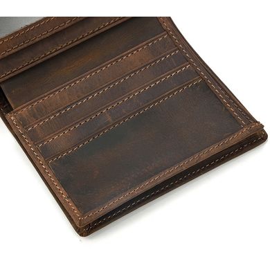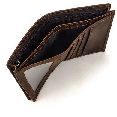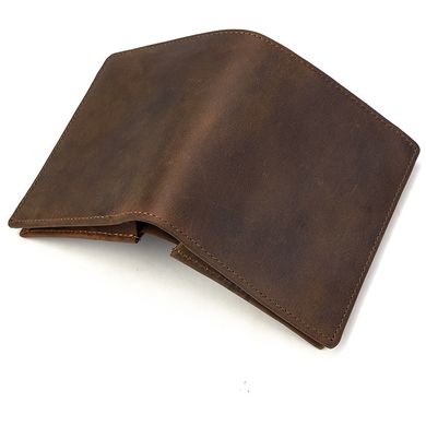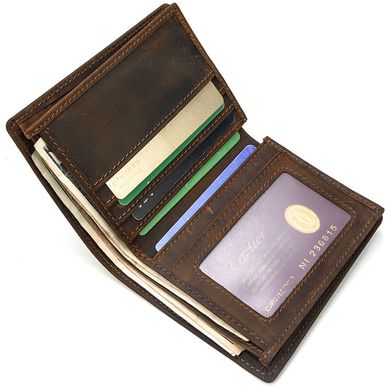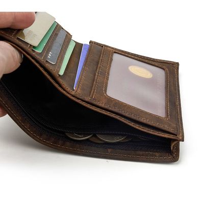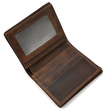 Üzleti pénztárca valódi marhabőrből, barna színű, papírpénz, érmék, kártyák, dokumentumok és fényképek tárolására alkalmas, zárt mérete 11,5×9,5×2 cm.