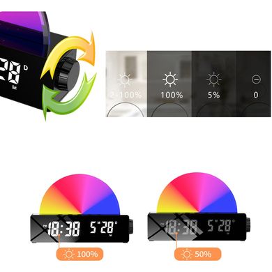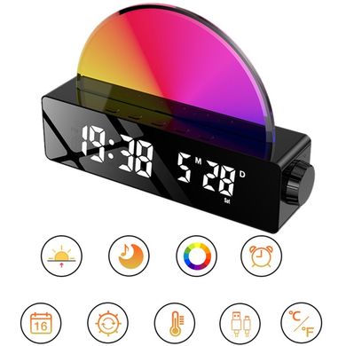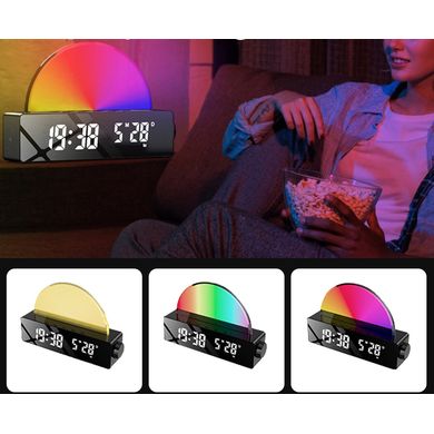 Ébresztőóra állítható fényerővel, dátum és szobahőmérséklet kijelzéssel, RGB lámpa, éjszakai üzemmód csökkentett fényerővel.