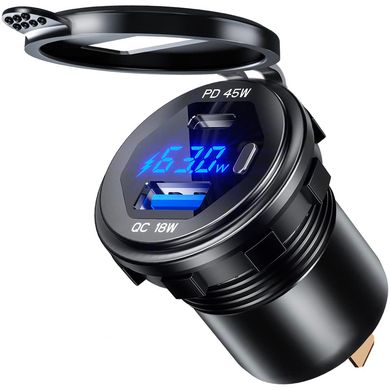 Beépített aljzat feszültségmérővel, MOTO-hoz és autókhoz alkalmas, USB és USB-C csatlakozó, PD és QC 3.0 támogatás, kék LCD, 30 mm-es beszerelési furat.